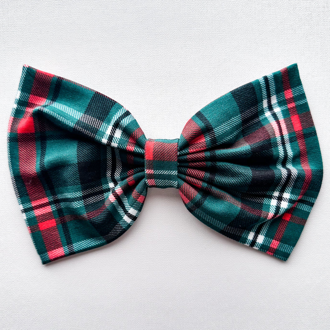 Our "scarf bows" are by far our largest bow. They're only available on alligator clips b/c they're too big for the nylon headbands. The bow measures 4.75" by 6.5".
